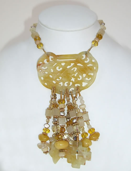 PJ109 - "Liquid Butterscotch" Carved yellow jade from whick butterscotch amber, calcite, citrine, pearls and vermiel cascade, creating a waterfall. 18" - $900