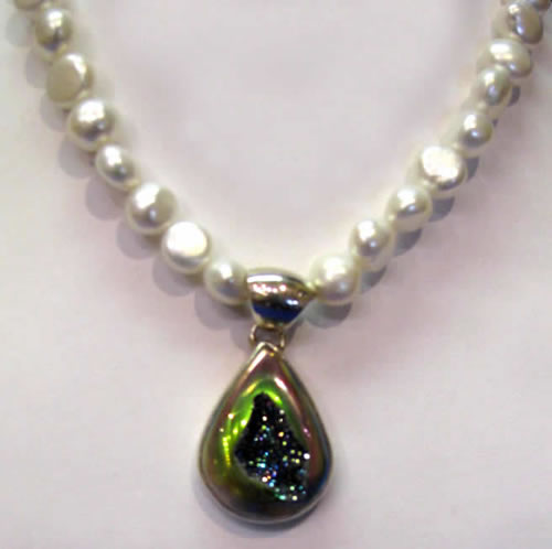 10. PJ142 - "Rainbow In A Raindrop" Drop shaped drusy that flashes all those colors set in sterling silver. Simple strand of 9mm pearls finished with a heart-shaped toggle classp. 17" - $375 |