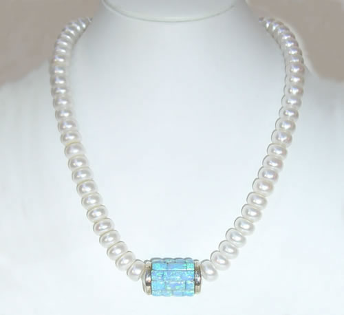 PJ118 - Elegant freshwater button pearls with removable slide cylinder of sterling silver and man-made opals, Sterling silver easy-on clasp. 171/2 " - $500